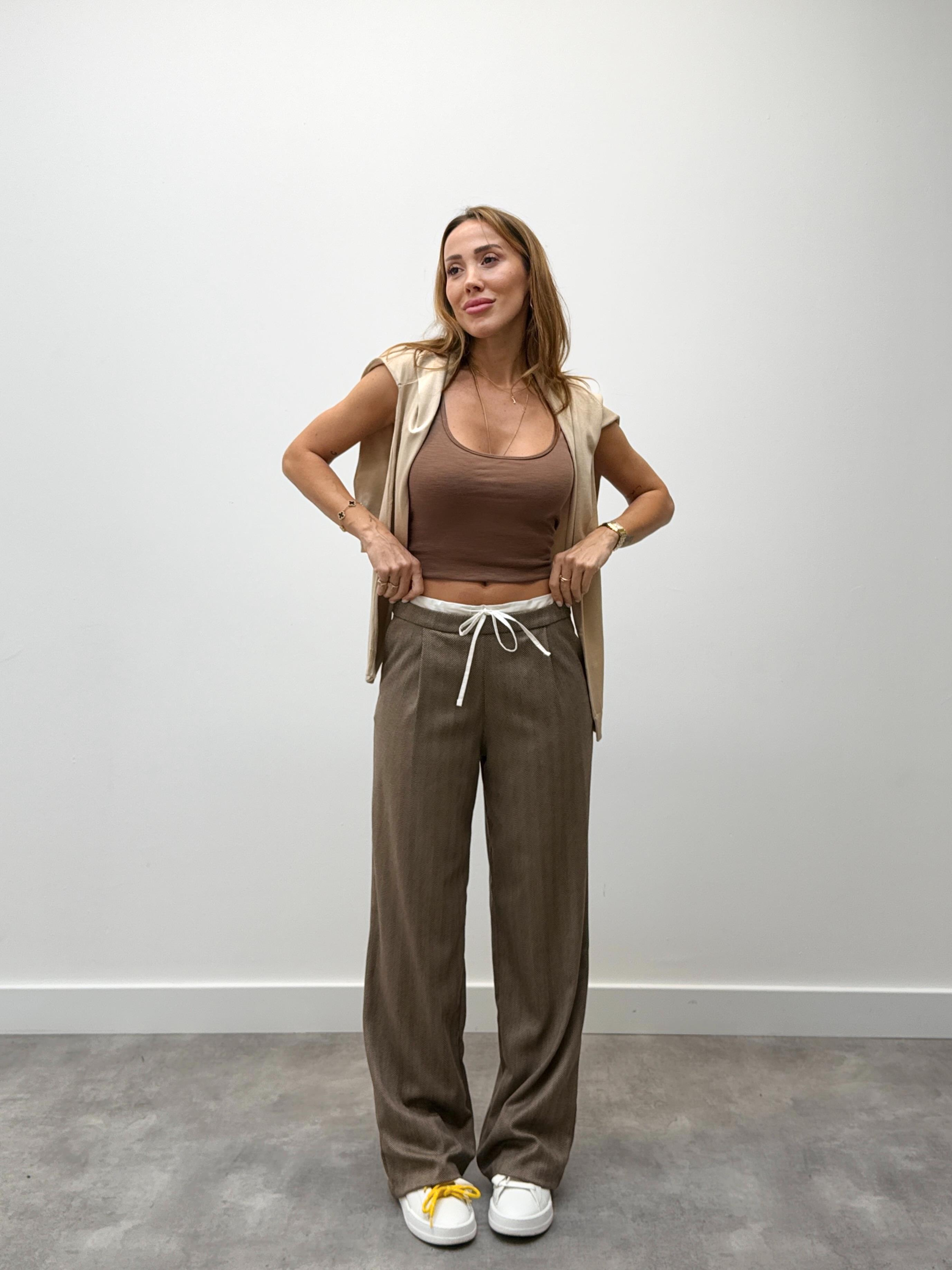 Kadın Çift Bel Bantlı Wıde Leg Bağcıklı Kahverengi Pantolon